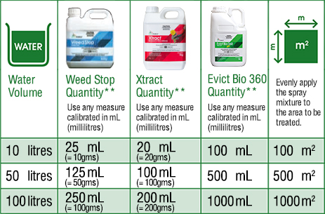 The example below uses the Weed Stop and Xtract rate recommended for long term weed control and the Evict Bio 360 rate recommended for general weed control in Domestic areas, Commercial, Industrial and Public Service areas, Agricultural buildings and other farm situations **