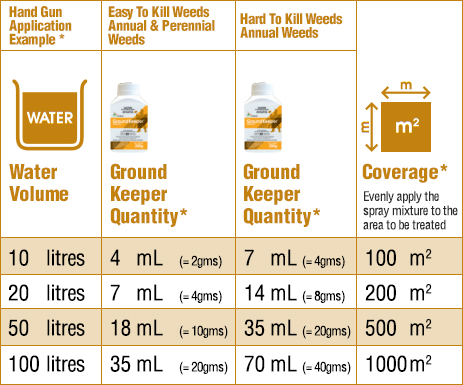 The Ground Keeper label recommends rates in grams. The following table can be used as a guide to measure Ground Keeper herbicide using common measure cups graduated in millilitres (mL). If you have access to scales that can weigh small amounts, this will be a more accurate measure. The example used below is for Weed control using high volume hand gun application. Ground Keeper is not designed to kill large established weeds.
